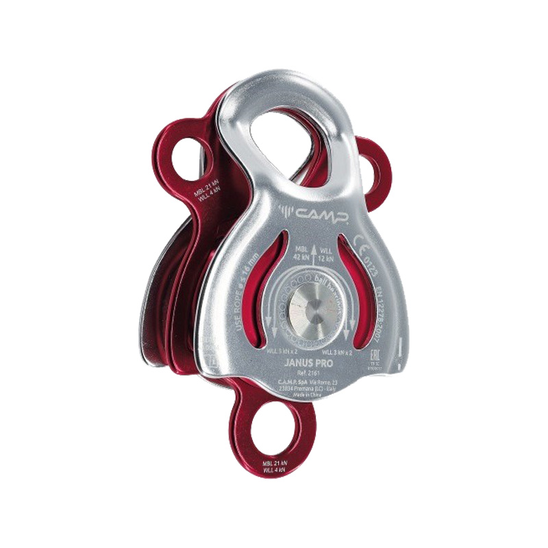 - Features a large wheel, a main attachment point that accommodates three carabiners